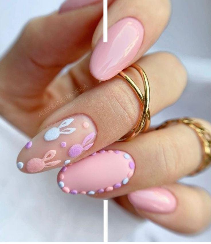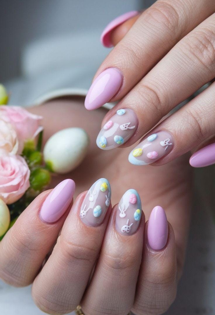 A delicate mix of glossy pink nails and sheer accent nails featuring tiny pastel bunnies and dotted details. The look is soft, cute, and perfectly whimsical for spring.