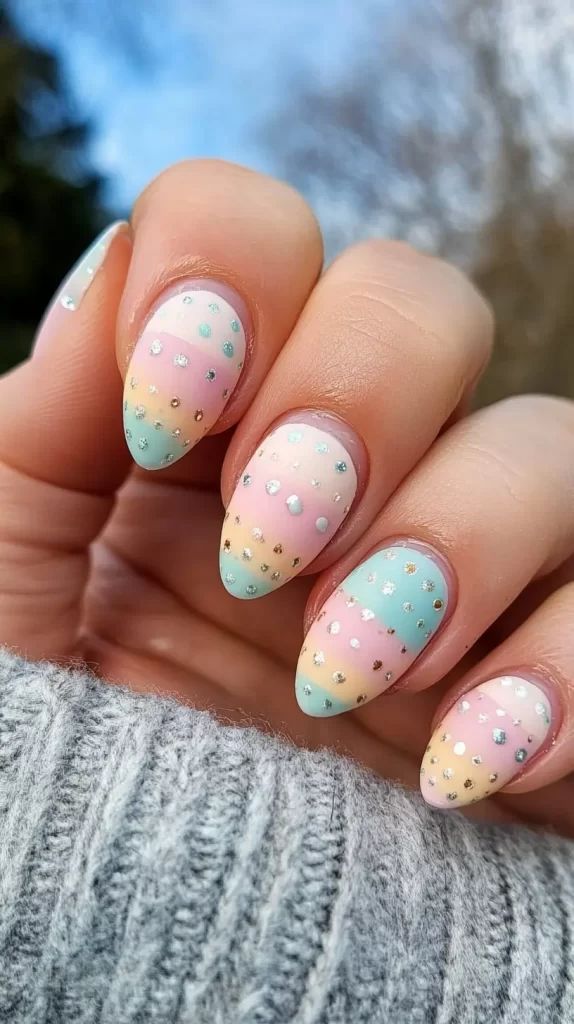This design features soft pastel gradients in pink, mint, yellow, and blue, topped with delicate dot accents that resemble classic Easter egg speckles. The overall vibe is light, festive, and sweet with a springtime feel.