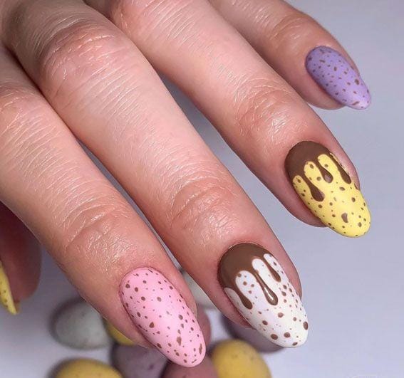 Soft pastel shades like lilac, blush pink, yellow, and white are topped with playful speckles and glossy chocolate-drip accents. The design feels sweet and festive, just like decorated Easter eggs.