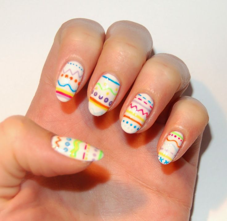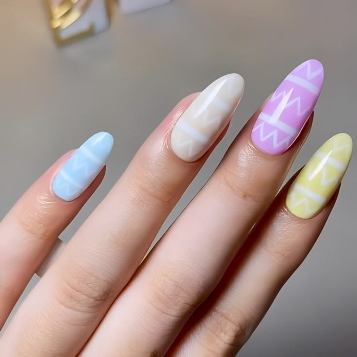 Smooth pastel nails in blue, cream, pink, and yellow are decorated with simple zigzag and line patterns inspired by decorated Easter eggs. The design is clean and modern with a soft seasonal touch.