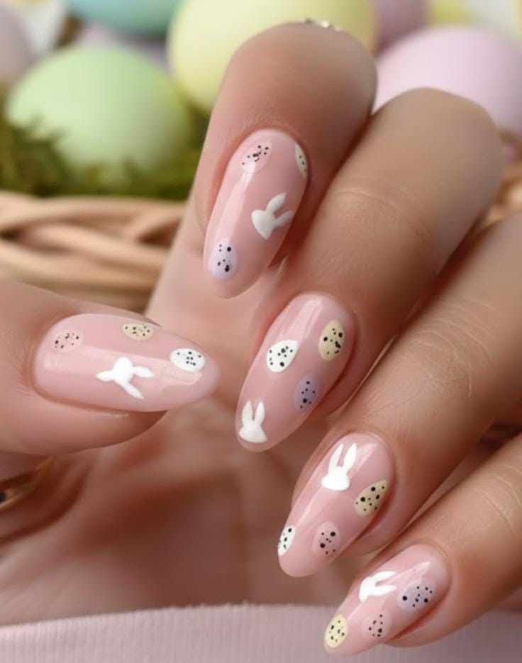 A glossy nude-pink base is accented with tiny speckles, pastel egg shapes, and simple white bunny silhouettes. The design is subtle, modern, and sweet with a soft seasonal touch.