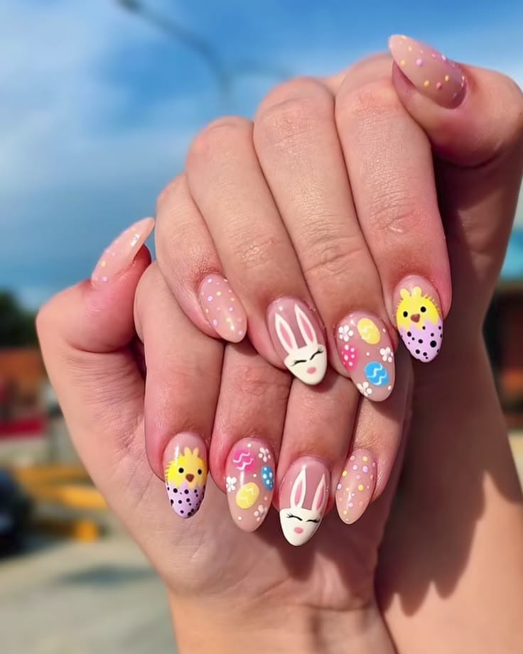 These almond-shaped nails feature soft pinks with playful Easter accents like 3D bunny faces, colorful eggs, and tiny polka dots. The overall vibe is cute and festive, blending sweet spring pastels with charming holiday details.