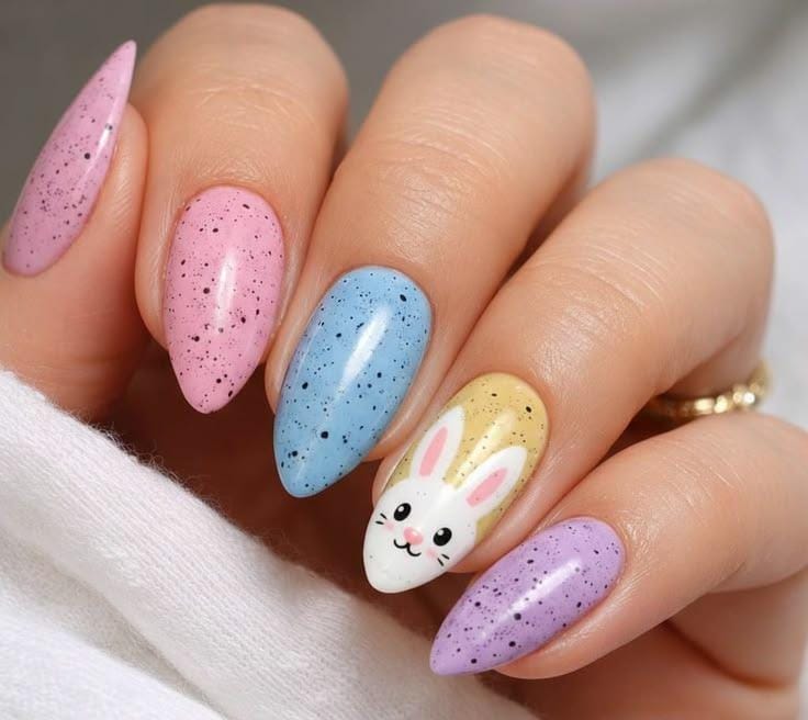 This design mixes pastel pink, blue, yellow, and lavender shades with a subtle speckled “egg shell” effect. A single bunny accent nail adds a fun focal point, giving the set a soft yet playful Easter feel.