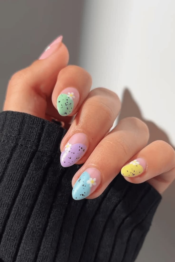 Soft pastel tones like mint, lilac, blue, and yellow are paired with delicate white daisies and black speckles. The look feels fresh and minimal, capturing a light, springtime Easter aesthetic.