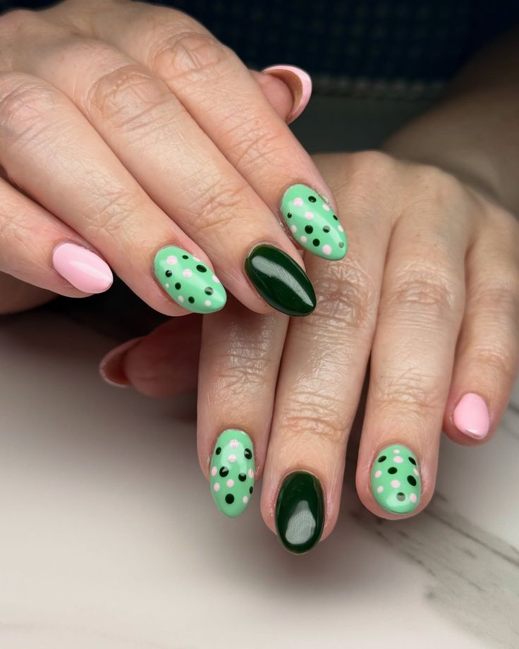 A mix of mint green, blush pink, and deep green creates a fresh spring palette with playful polka dots. The glossy finish and contrasting shades give it a bold yet festive Easter egg vibe.