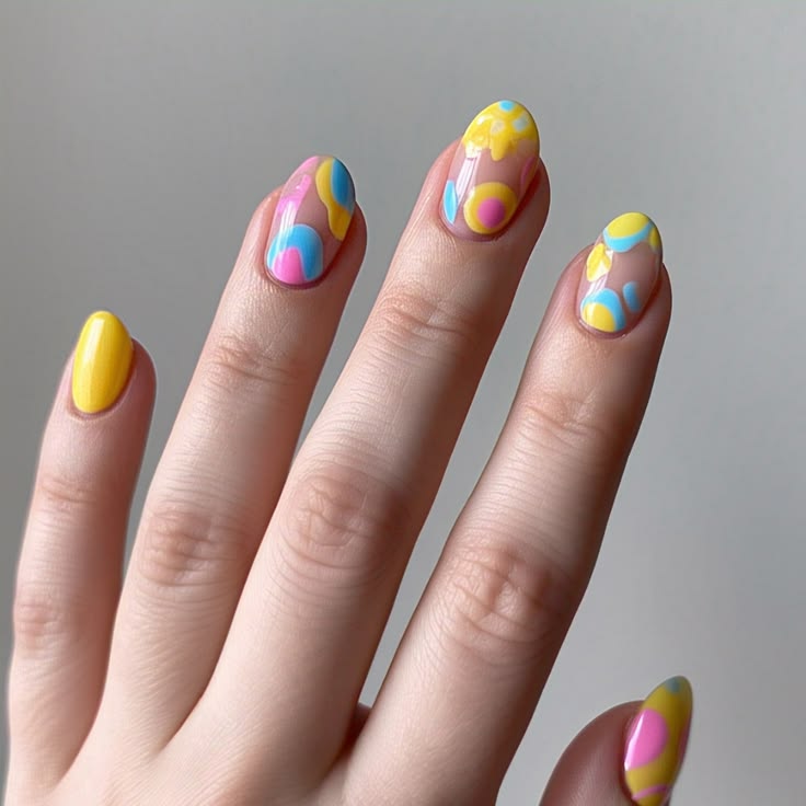 This short nail set features bright pastel swirls in pink, blue, and yellow over a neutral base, alongside a bold solid yellow accent nail. The abstract patterns give it a fun, artsy Easter egg vibe with a modern twist.