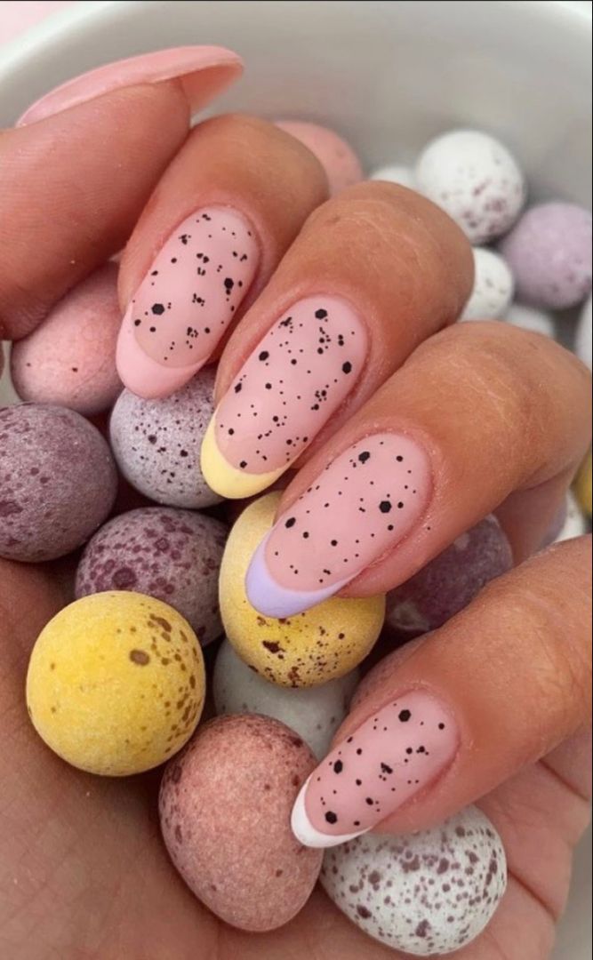 Soft pink almond nails are topped with pastel French tips and scattered black speckles for a chic Easter egg look. The design feels playful yet polished with its candy-colored accents and delicate splatter detail.