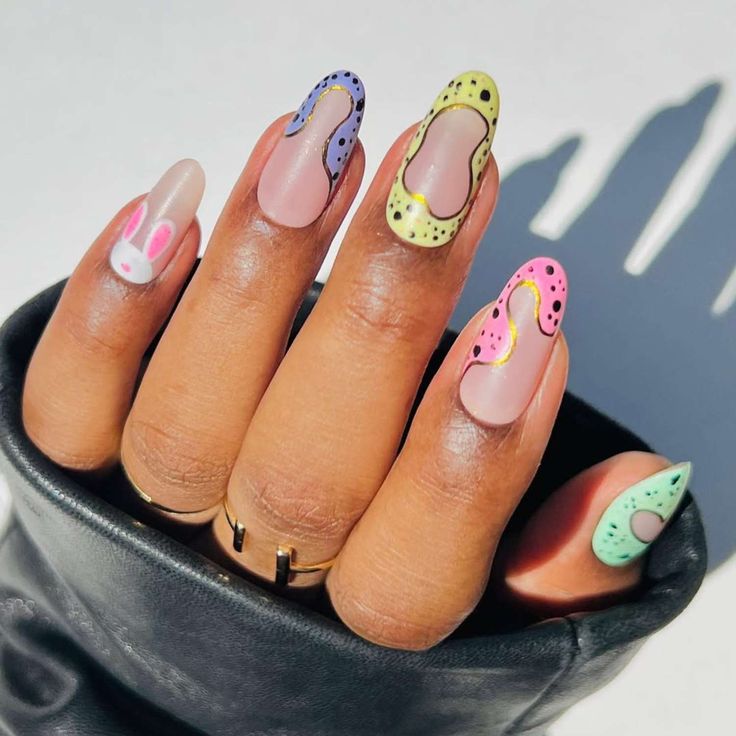 Each nail features a different pastel shade with soft polka dots and abstract egg-inspired shapes. The overall look is light, whimsical, and full of springtime charm.