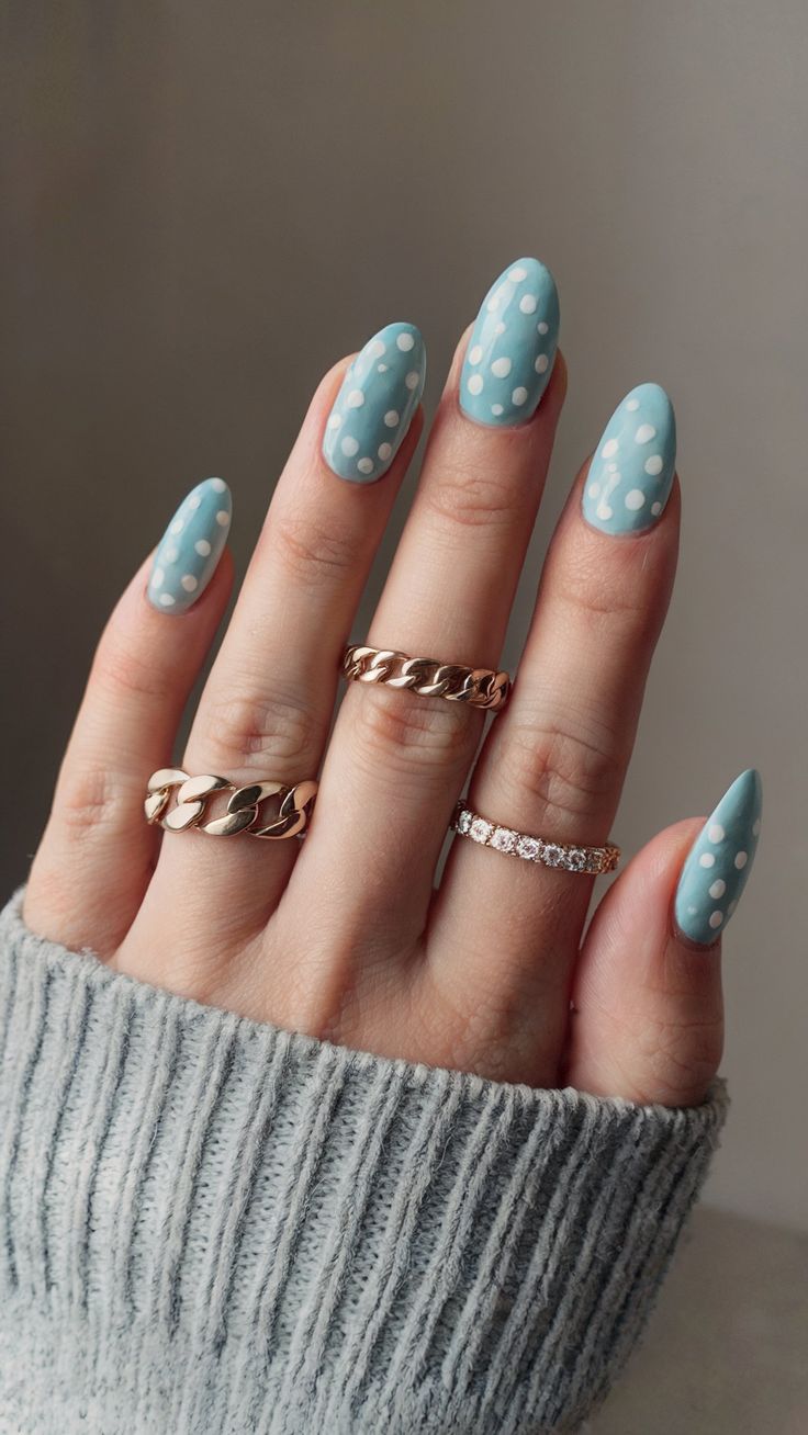 A muted sky-blue base is paired with simple white polka dots for a sweet, classic Easter feel. The clean almond shape and minimal pattern keep it fresh and effortlessly cute.