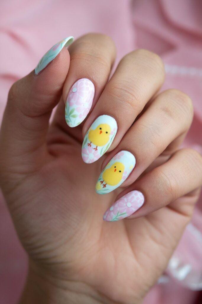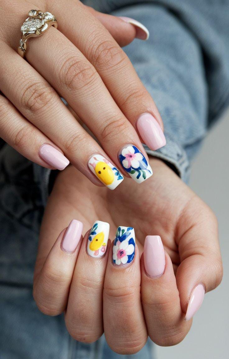 Light blush pink nails are paired with playful hand-painted flowers and a cute yellow chick accent. The design feels cheerful, fresh spring, and Easter-inspired look.