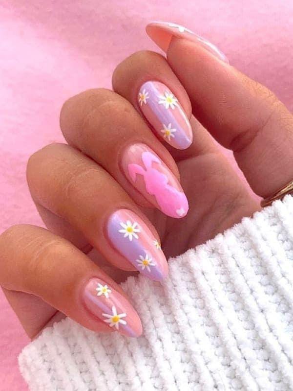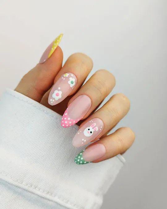 Soft pink and pastel nails mix polka-dot tips, floral details, and a cute bunny with a dotted accent. The overall spring vibe is fun, youthful, and full of Easter joy.