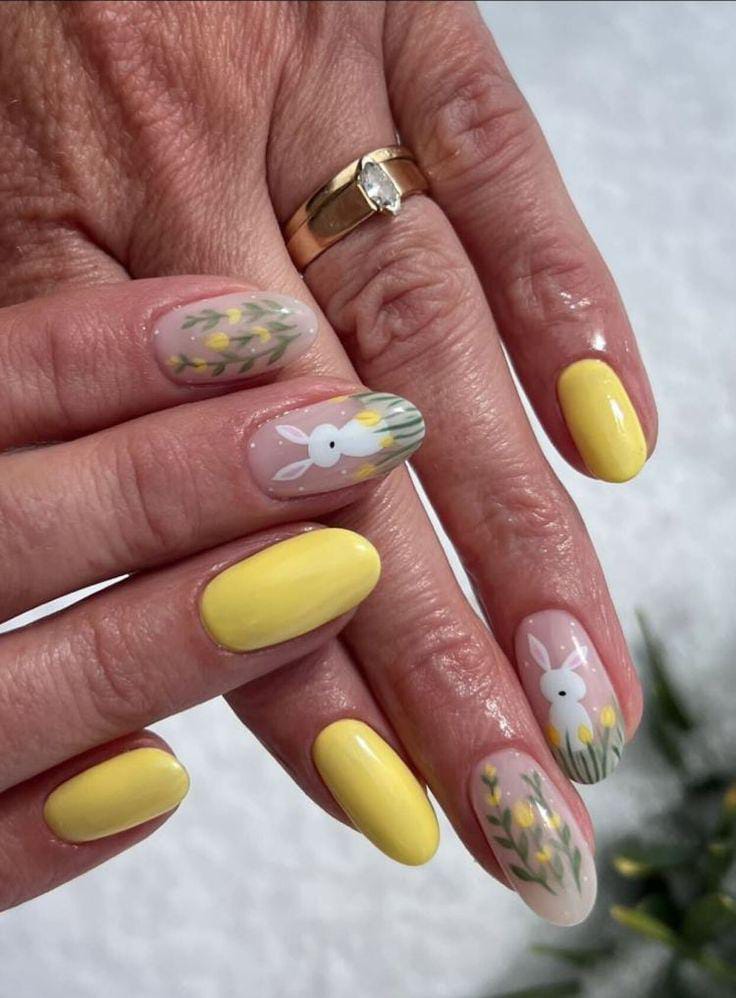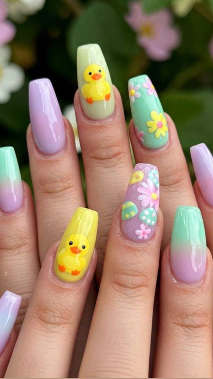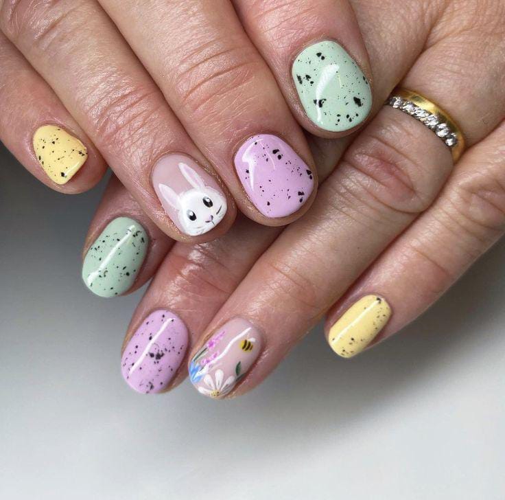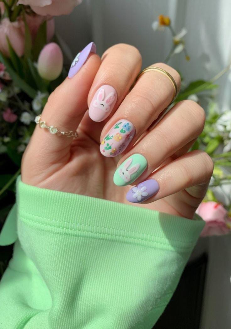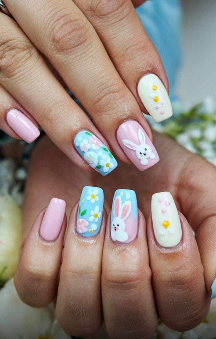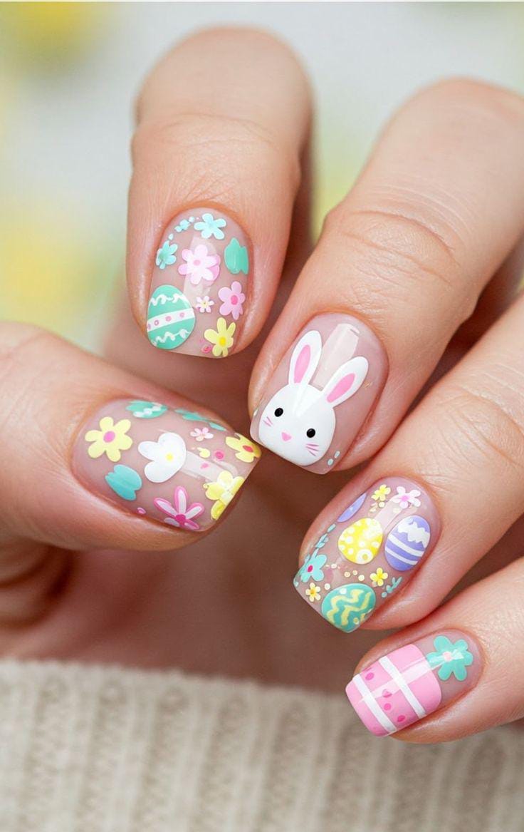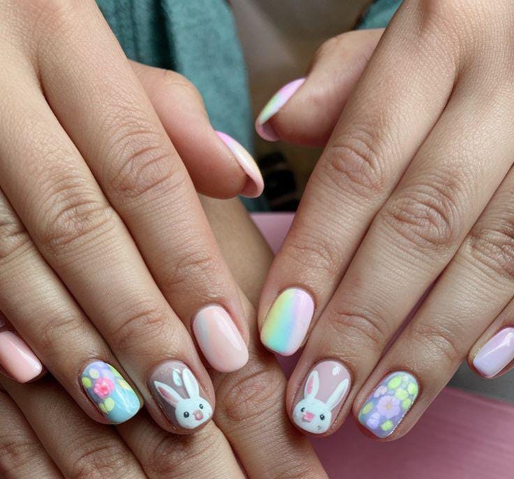 Glossy pastel shades are paired with adorable bunny faces, floral patterns, and a hint of soft rainbow details. The look is youthful, fun, and perfect for a playful spring and Easter celebration.