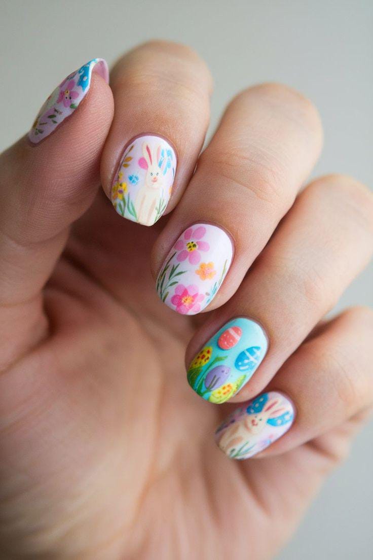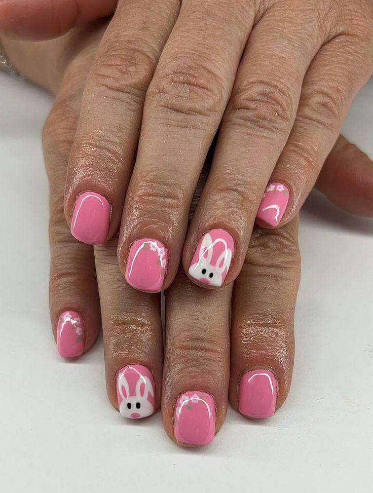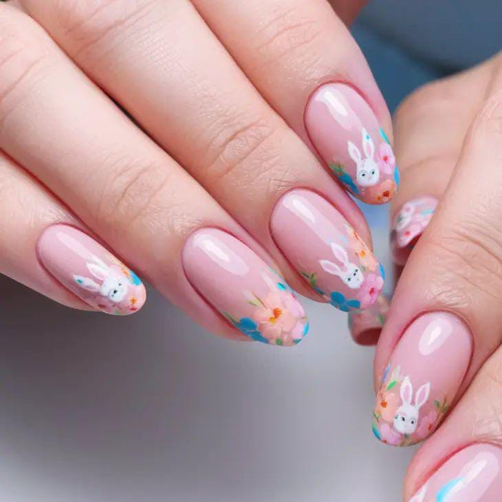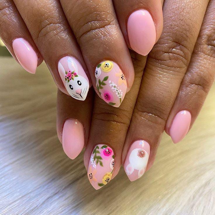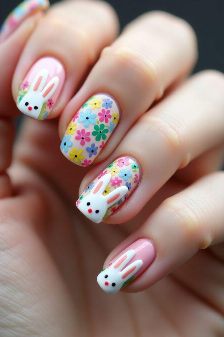 Soft pink nails are paired with colorful floral patterns and adorable 3d bunny faces for a cheerful Easter look. The overall style feels playful, fresh, and full of spring energy.