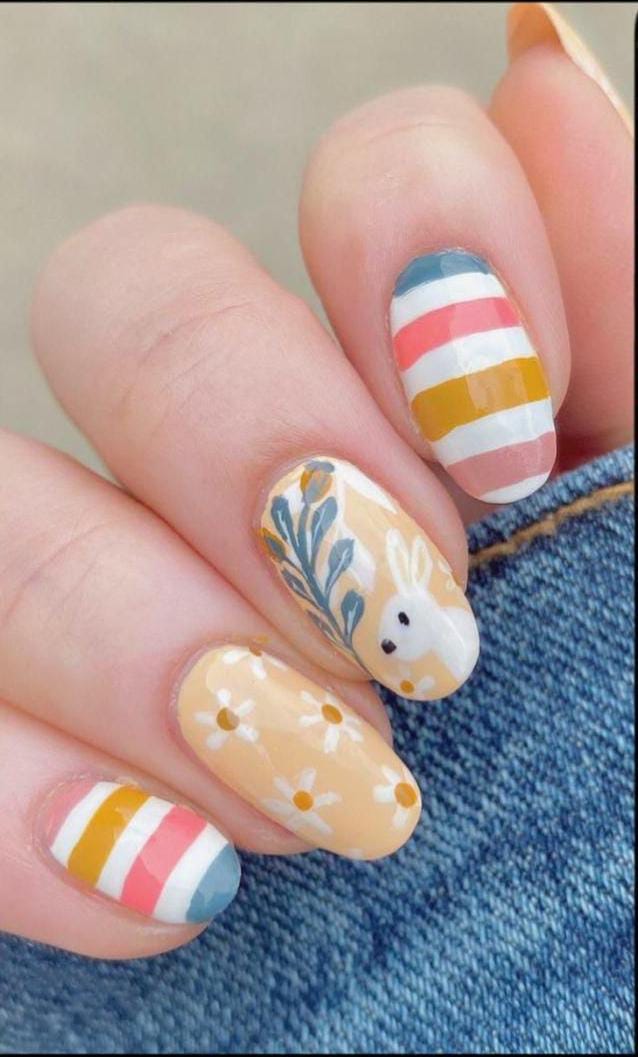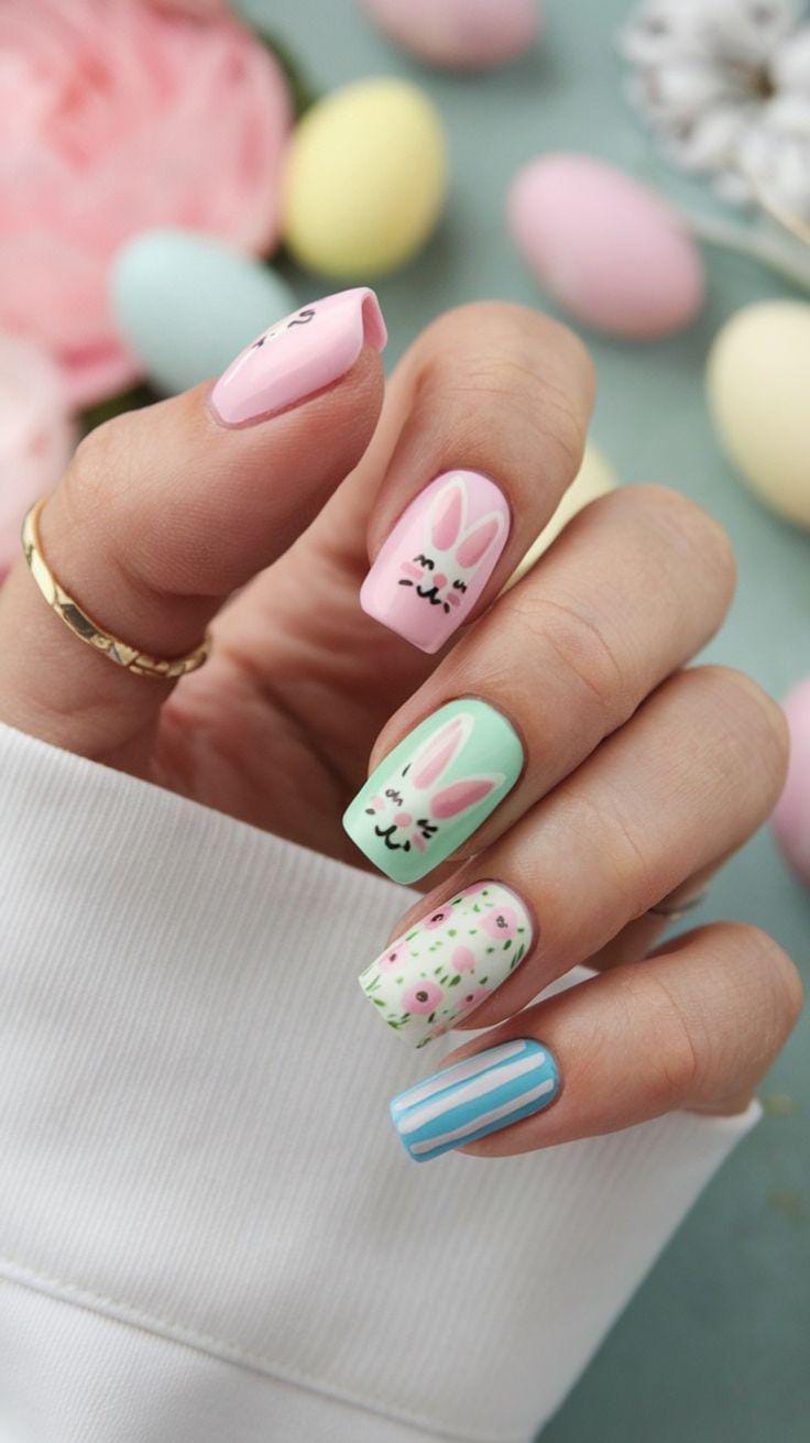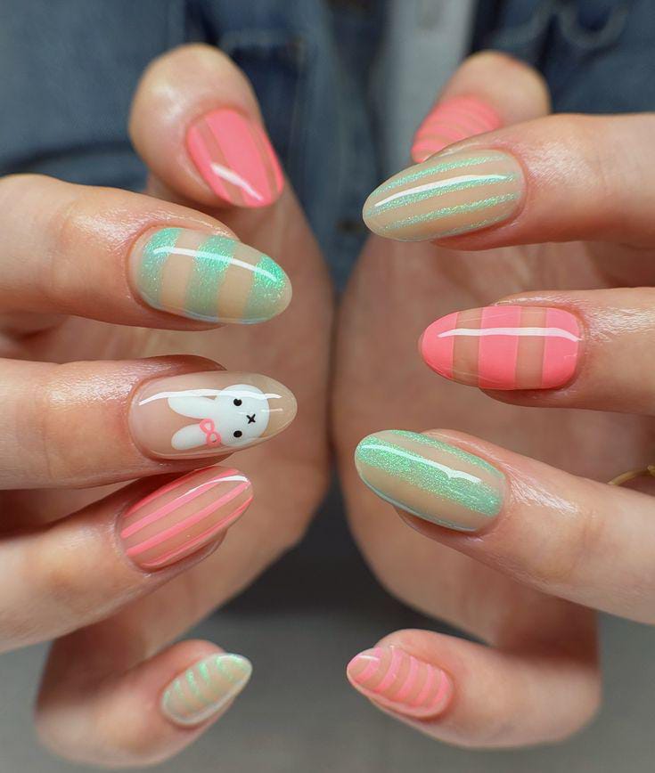 A fun combination of pastel pink, mint, and blue strips nails features smiling bunny faces, florals, and simple spring patterns. The playful variety gives it a cute, youthful Easter vibe.