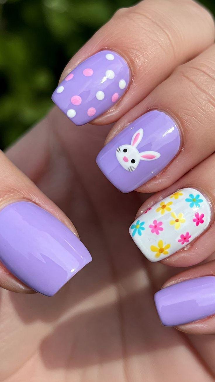 A glossy lavender base is combined with simple polka dots, tiny flowers, and a cute bunny white accent. The look is clean, bright, and perfectly balanced between fun Easter and minimal spring.