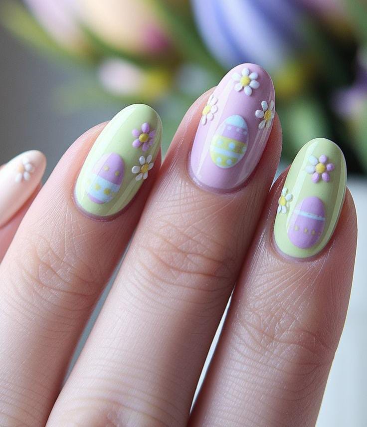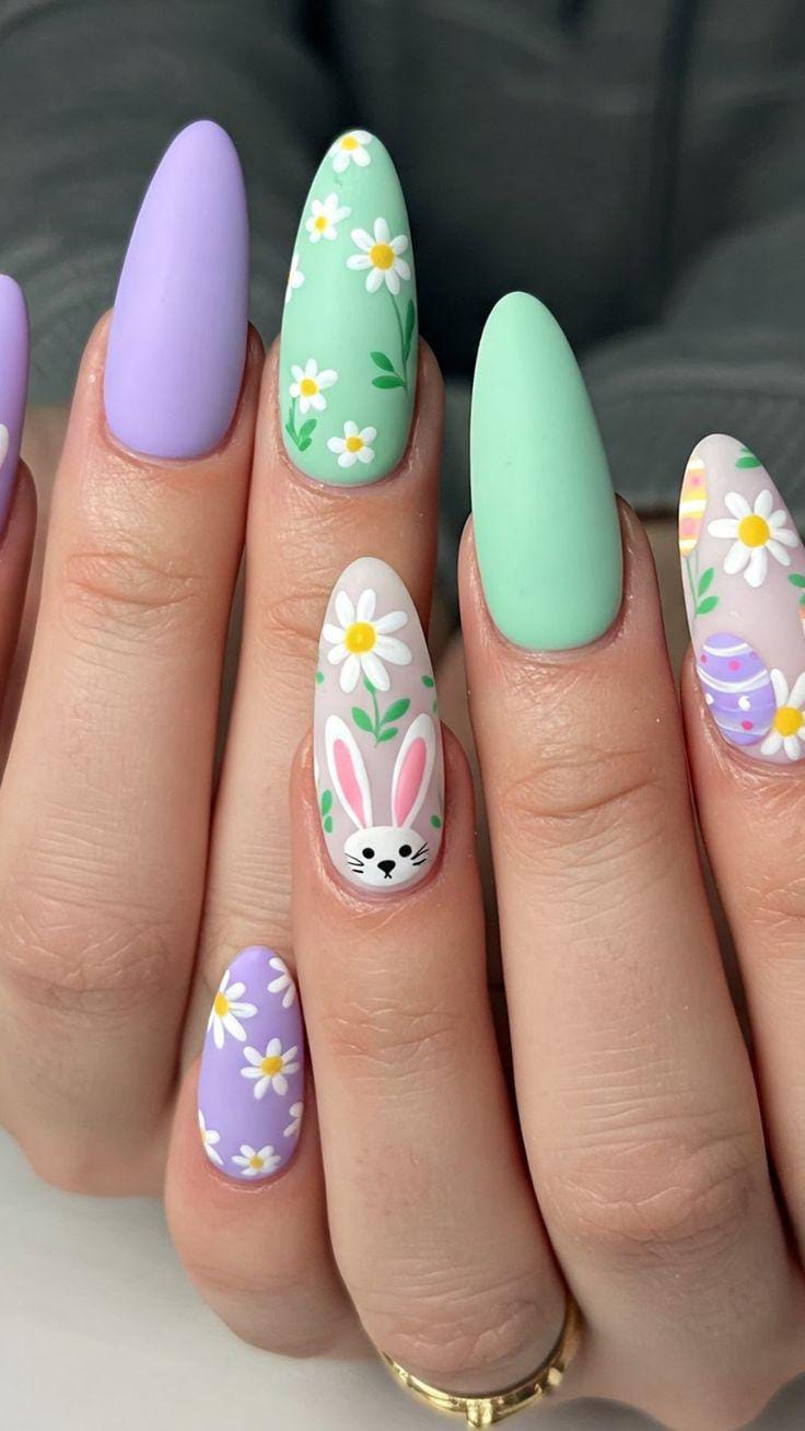 This set blends pastel purple, mint green and creamy accents with daisy patterns and a charming bunny feature for Easter festive. The almond shape and soft colors create a dreamy, spring meadow aesthetic.