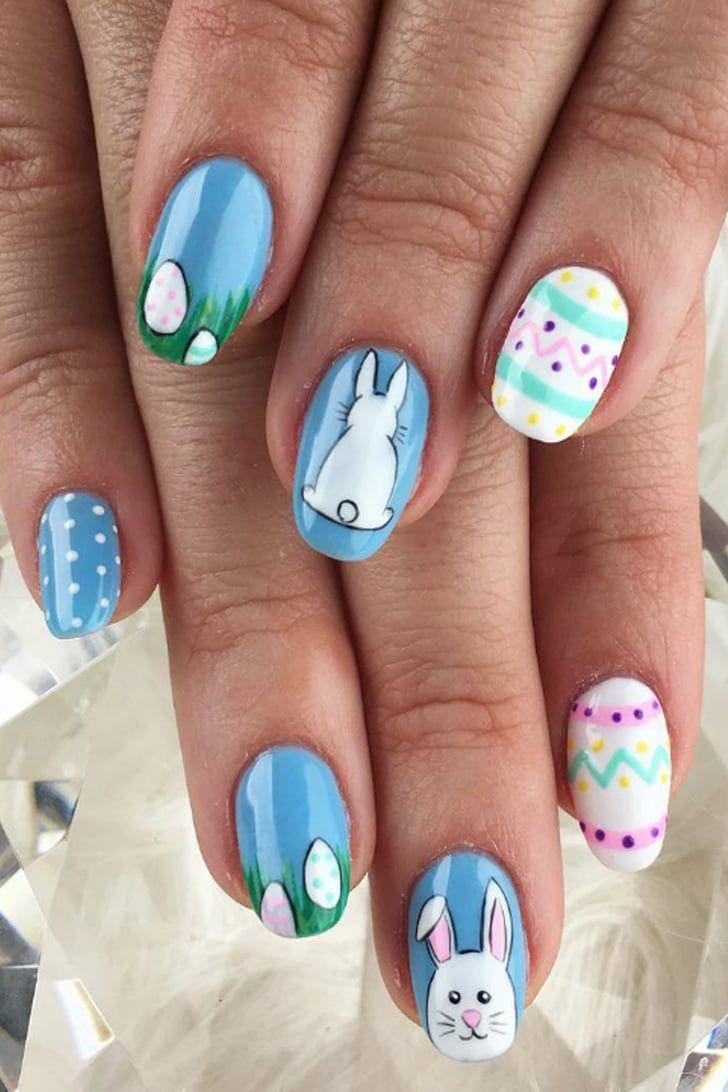 Soft blue nails mix with pastel Easter eggs, grass, dotted accents, and cute white bunny art for a playful spring look. The overall vibe is sweet, festive, and perfect for Easter celebrations.