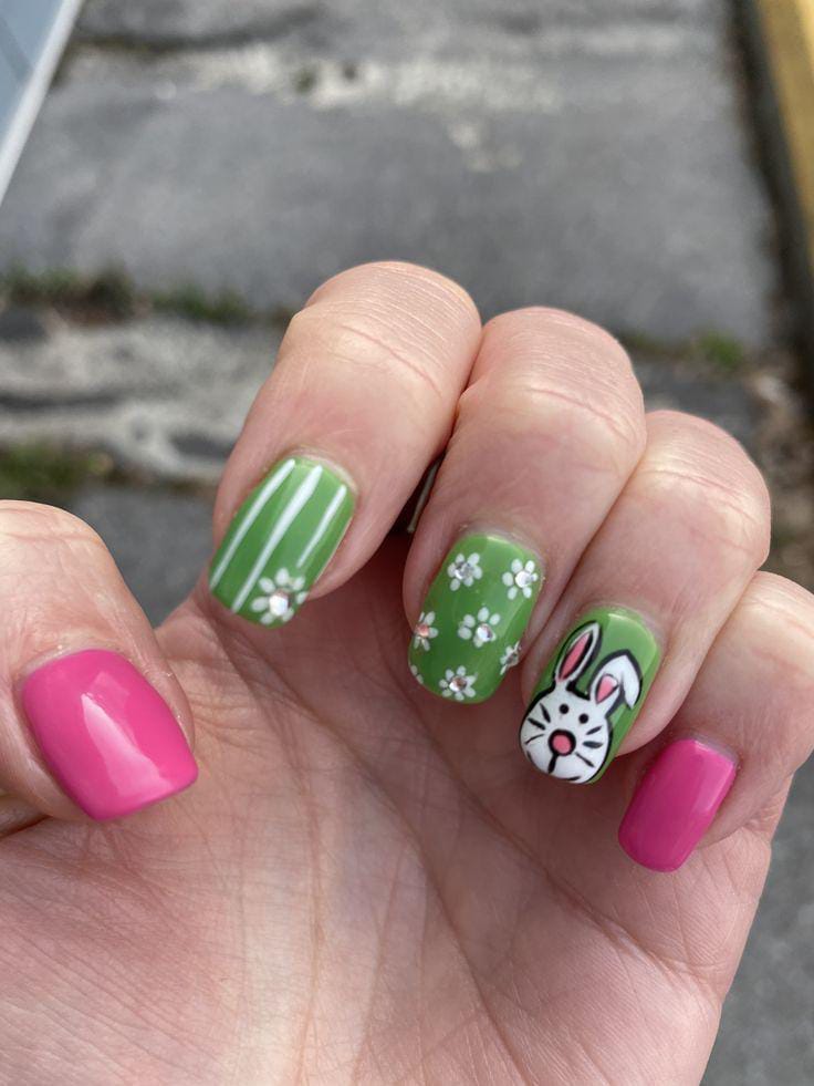 Bright green and pink nails are paired with tiny white flowers and a simple bunny accent. It feels fresh, cheerful, and inspired by blooming spring fields and perfect for the Easter festival.