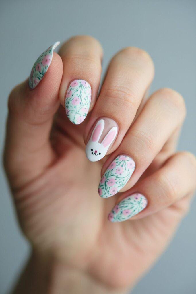 Pastel pink and mint nails are accented with a minimalist bunny face and subtle floral accents details . The overall look is clean, sweet, and softly Easter festive with a modern spring vibe.