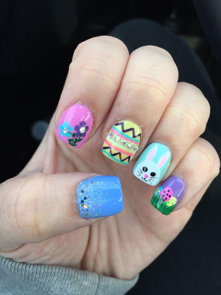 A colorful mix of pastels, nails, glitter, Easter eggs, flowers, gemstone and bunny art creates a lively, playful spring design. It has a fun, creative vibe that feels bright and Easter celebratory without being overwhelming.
