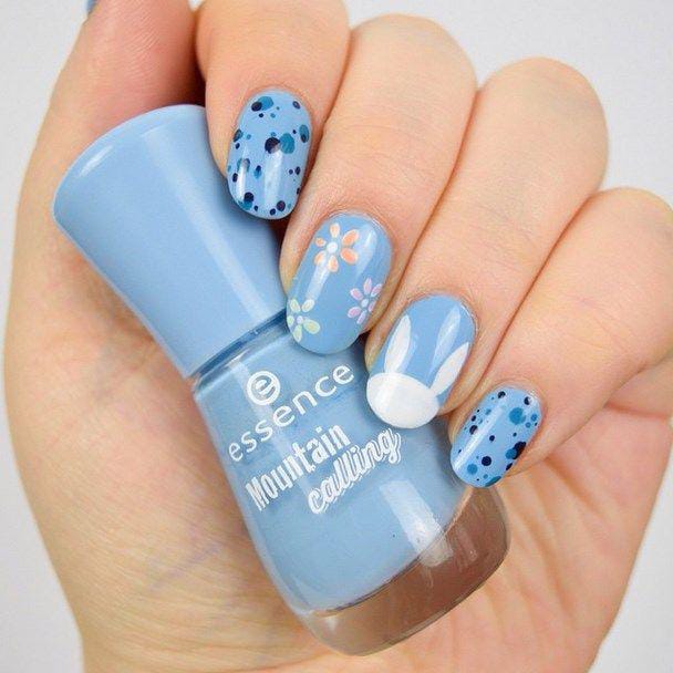 Cool baby-blue polish is paired with dainty flowers, speckles-like dots and a simple white bunny accent. The design feels calm, fresh, and inspired by early spring skies and perfect for the Easter festival.
