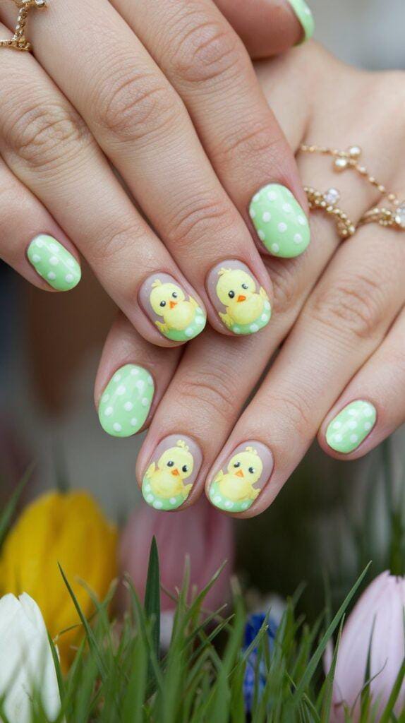 Mint green polka dots pair with adorable chick illustrations for a fun and youthful spring style. The look is bright, charming, and full of Easter joy.