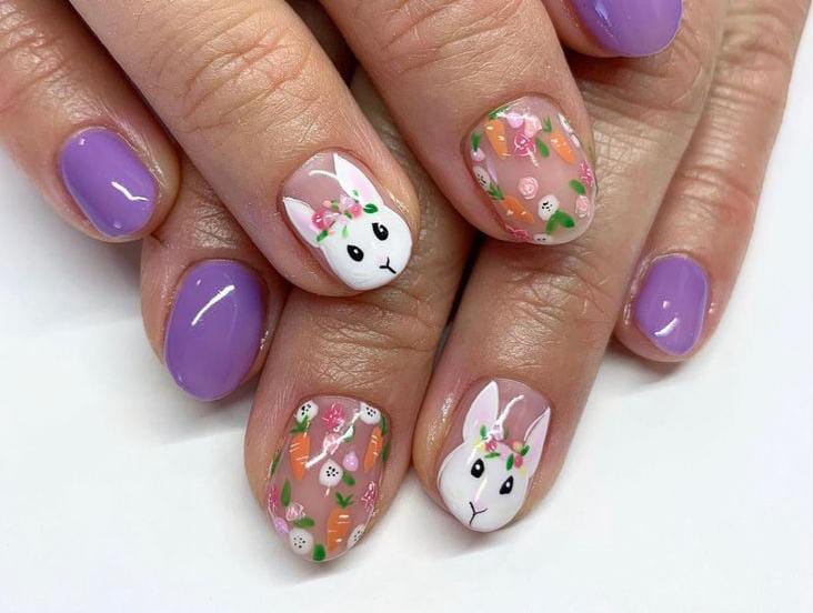 Glossy lavender and soft nude nails are combined with detailed bunny faces and carrot-inspired floral spring patterns. The overall style is cheerful, cute, and full of Easter personality.
