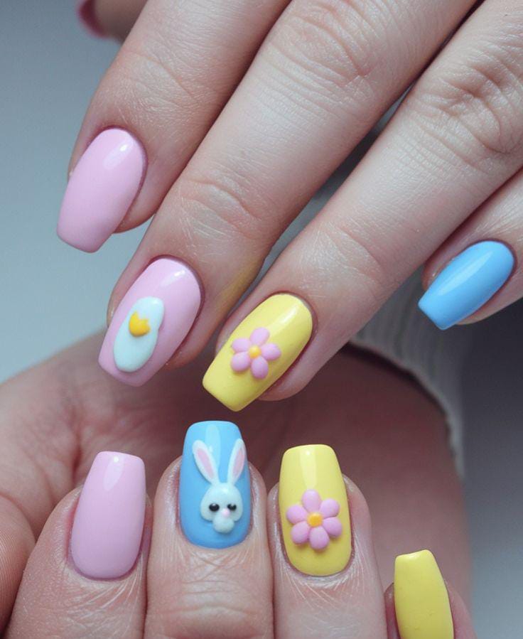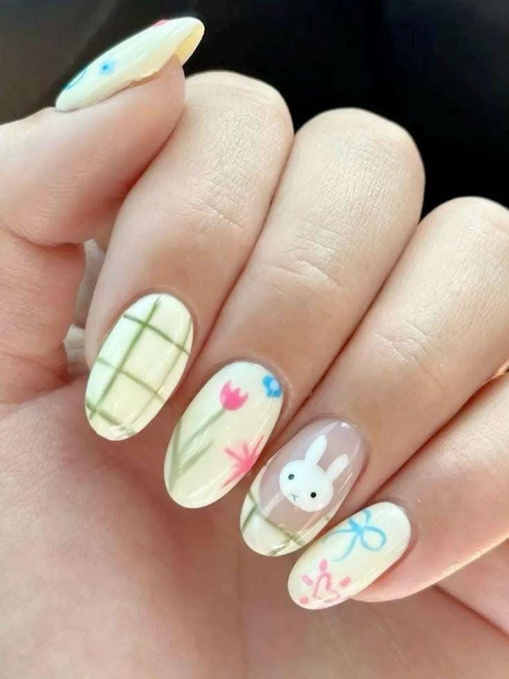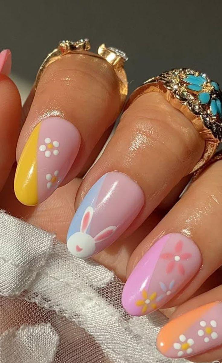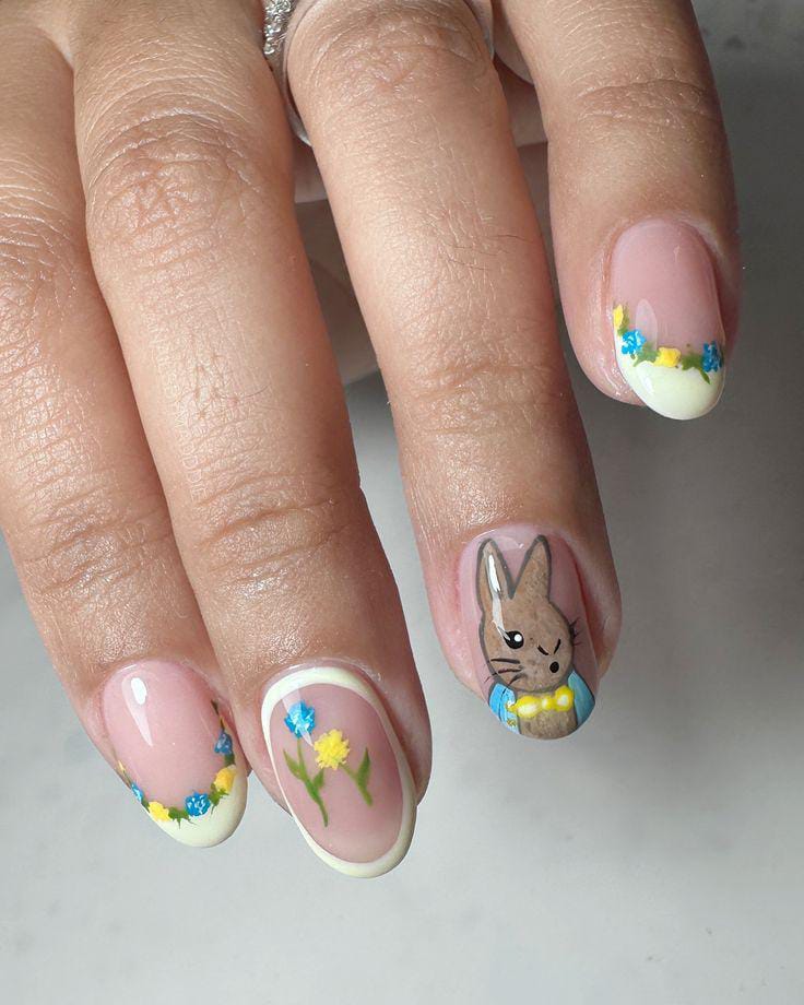 Soft pastel tip nails feature playful bunny accents, tiny florals, and gentle color blocking in pink, yellow, and blue. The overall vibe is sweet, cheerful, and very springtime-cute Easter vibe.