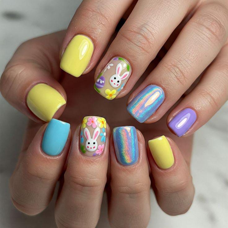 Bold pastel solids are mixed with holographic accents and floral bunny nail art. The overall style is vibrant, playful, and full of Easter joy with a modern spring twist.