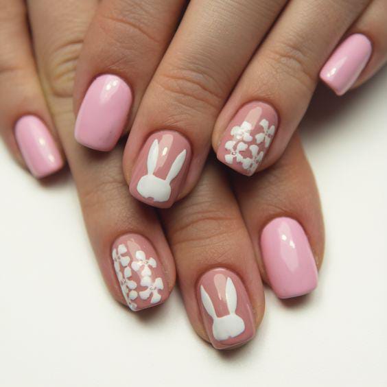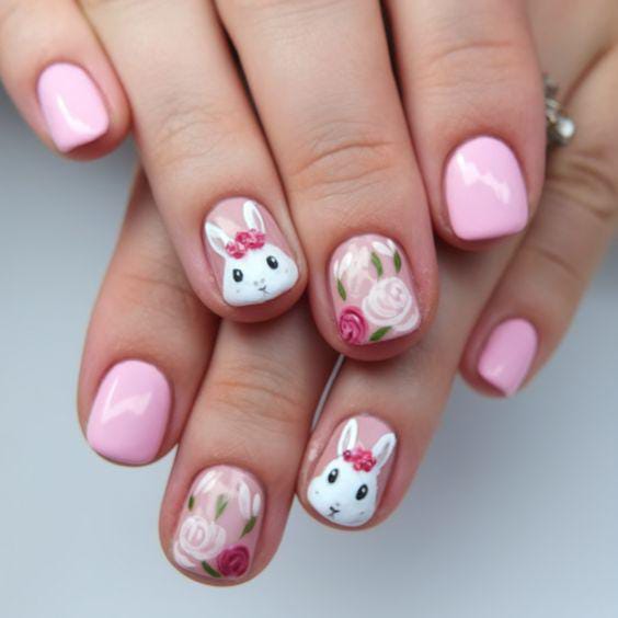 Glossy pink nails are paired with soft floral details and cute bunny art on nude pink nails for a gentle, romantic spring feel. The design is elegant yet playful, perfect for Easter celebrations.