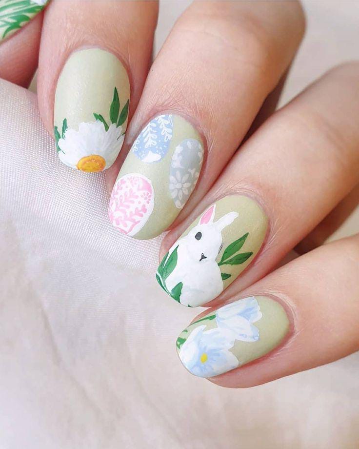 Soft sage green nails feature delicate hand-painted flowers and a sweet white bunny for a calm, storybook Easter vibe. The look feels whimsical, fresh, and inspired by spring meadows.