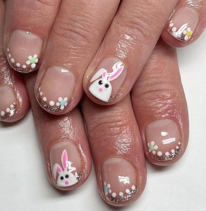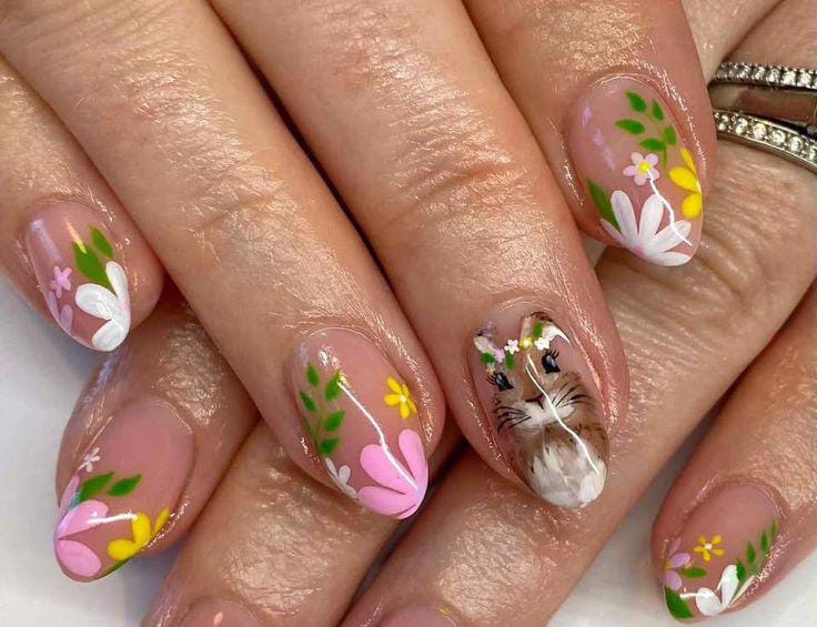 Light nude and white nails feature delicate floral patterns with a minimal bunny face accent. The look is gentle, elegant, and subtly festive Easter and for spring.