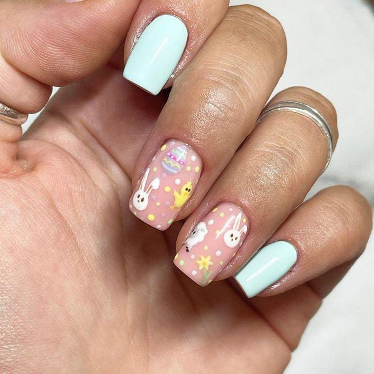 Pastel pink and mint nails are dotted with tiny bunnies, chicks, and Easter egg details, delicate tiny flowers for a fun, playful look. This design feels youthful, colorful, and full of holiday spring cheer.