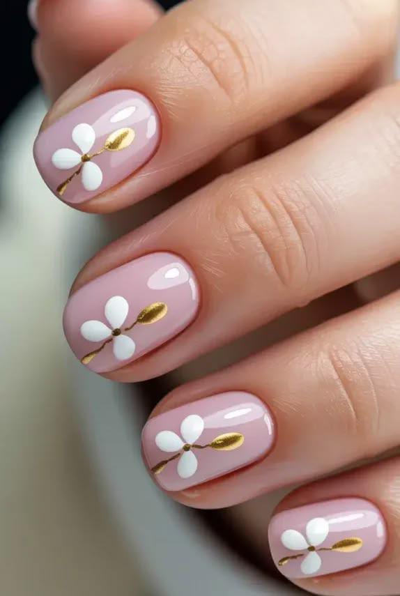 Soft pink nails are paired with delicate daisy accents on a nude base, creating a light and feminine spring look. The design feels fresh, playful, and perfect for a simple April manicure.