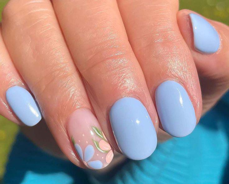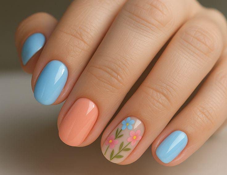 Soft pastel blue and peach shades create a fresh spring look with a delicate floral accent on one nail. The design feels light, cheerful, and perfect for a simple April-inspired manicure.
