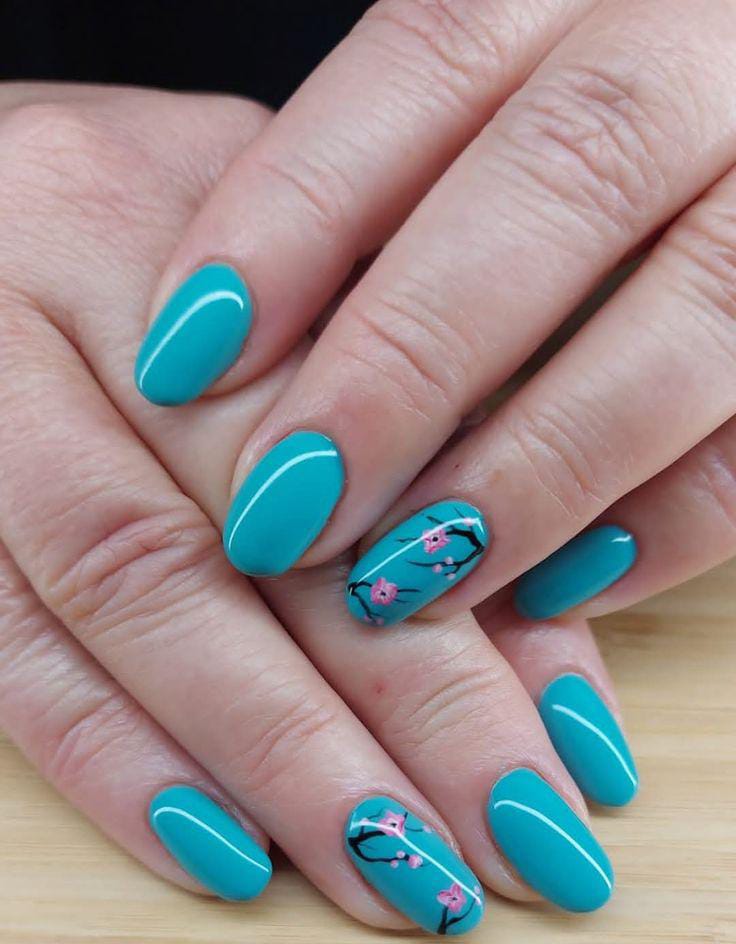 These nails feature a vibrant turquoise color that feels bright and lively for spring days. A couple of accent nails show delicate branch and blossom art, giving the design a subtle floral April elegance.