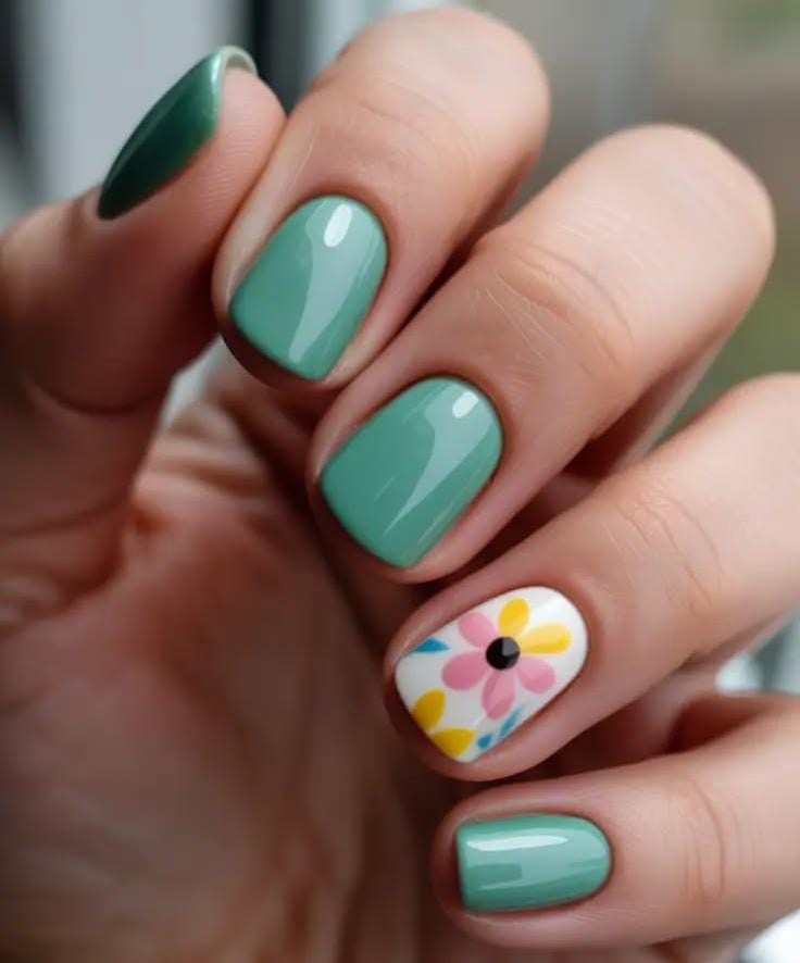 These April nails feature a soft green color with a glossy finish that feels fresh and clean for spring. One accent nail shows a colorful daisy pattern that adds a cheerful floral touch.