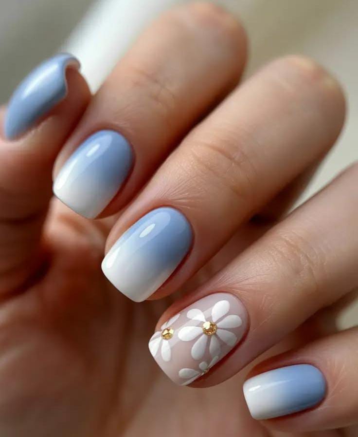 This manicure blends a gentle blue-to-white ombre effect for a light and airy spring look. A daisy accent nail with small golden centers adds a delicate floral April charm.