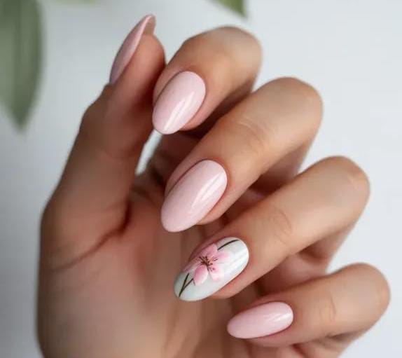 These almond-shaped nails feature a soft blush pink base that gives a clean and elegant spring look. One accent nail shows a delicate pink flower with subtle green line, adding a gentle April floral touch.