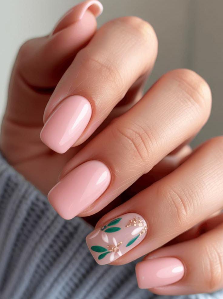 These short square nails are painted in a smooth pastel pink shade that looks simple and polished. A single accent nail includes tiny leafy details and a hint of gold, giving the design a fresh and delicate April spring vibe.