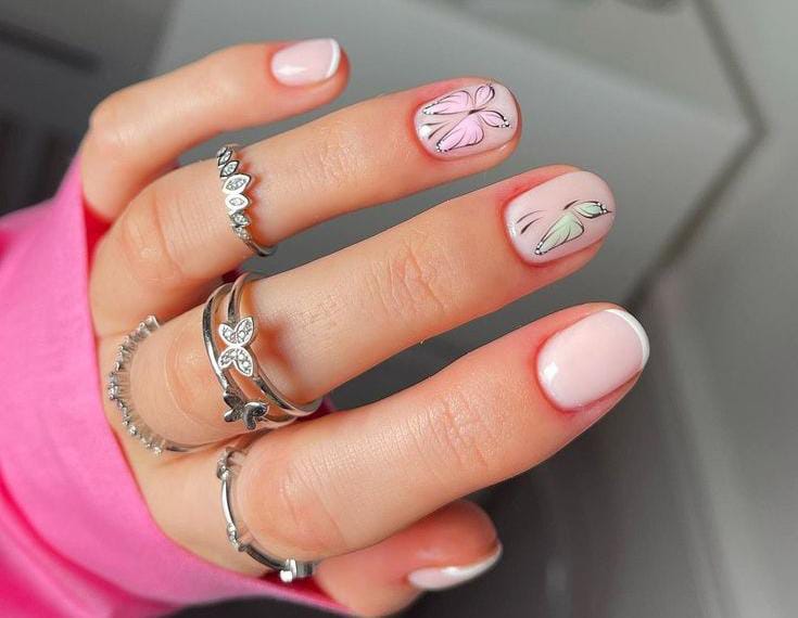 These short nails feature a soft natural base with a clean and minimal look. A few nails are decorated with simple pastel butterfly designs, giving the manicure a fresh and delicate April spring feel.
