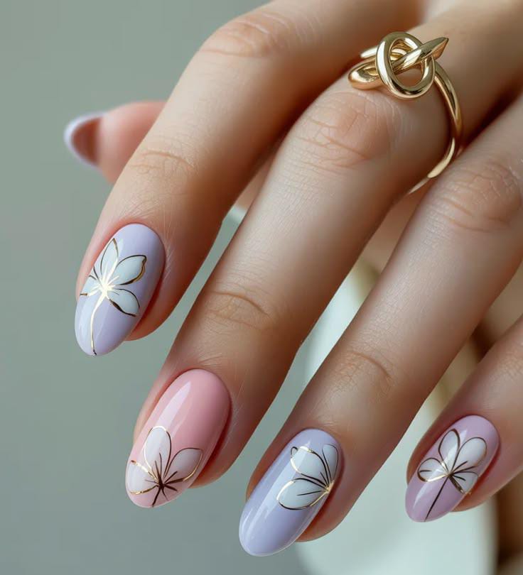 A mix of soft pastel pink and lavender nails is paired with elegant gold line-art flowers for a light spring look. The glossy finish and delicate simple floral patterns create a graceful and feminine April vibe.