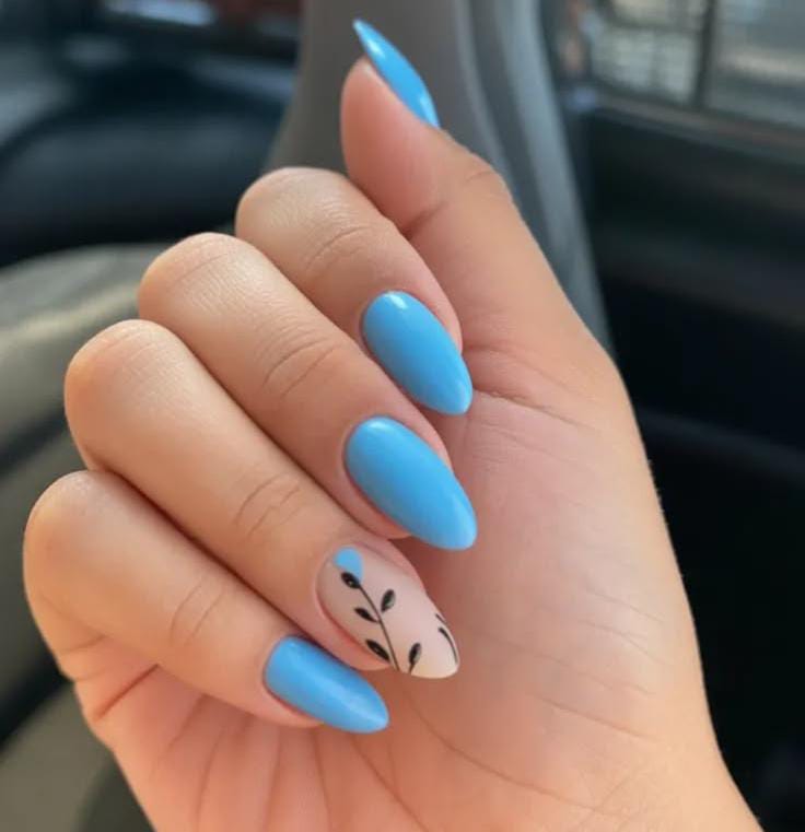 These almond-shaped nails are painted in a bright sky blue shade that feels fresh and bold. One accent nail has a soft nude base with a simple black leaf pattern, adding a modern April botanical touch.