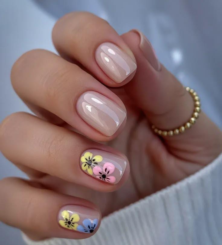 Soft nude glossy nails are decorated with small pastel flowers in yellow, pink, and blue for a gentle spring vibe. The design looks fresh, playful, and perfect for simple April nail inspiration.