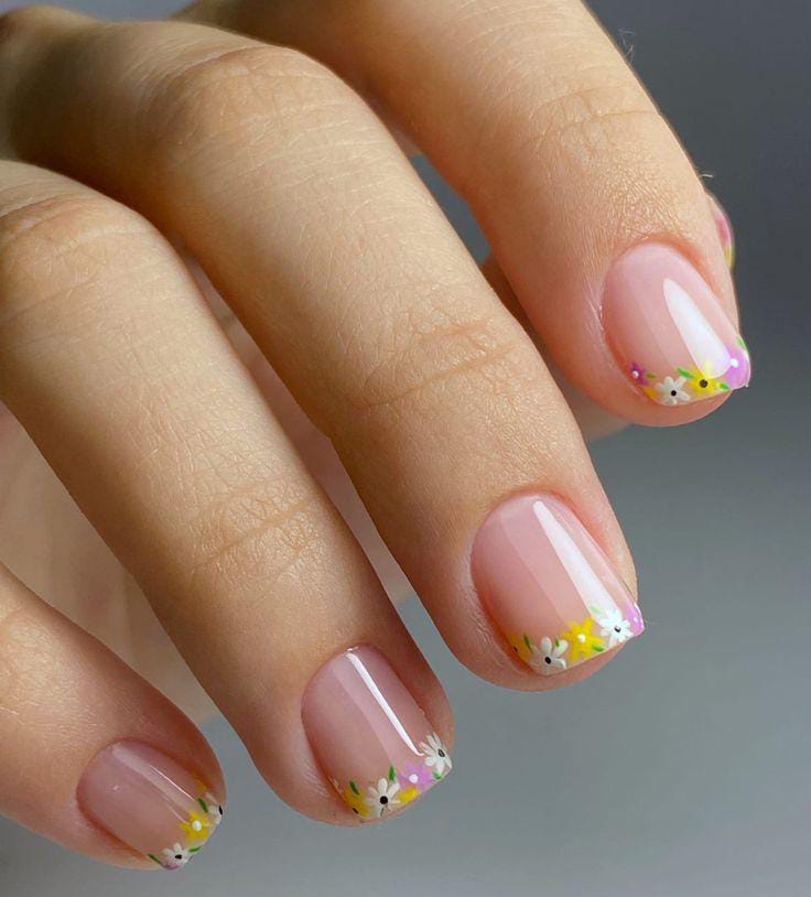 A natural base is paired with delicate mini daisies placed along the tips for a subtle floral French effect. The look feels light, elegant, and perfect for an easy everyday April spring manicure.