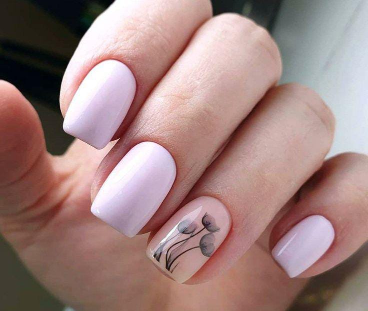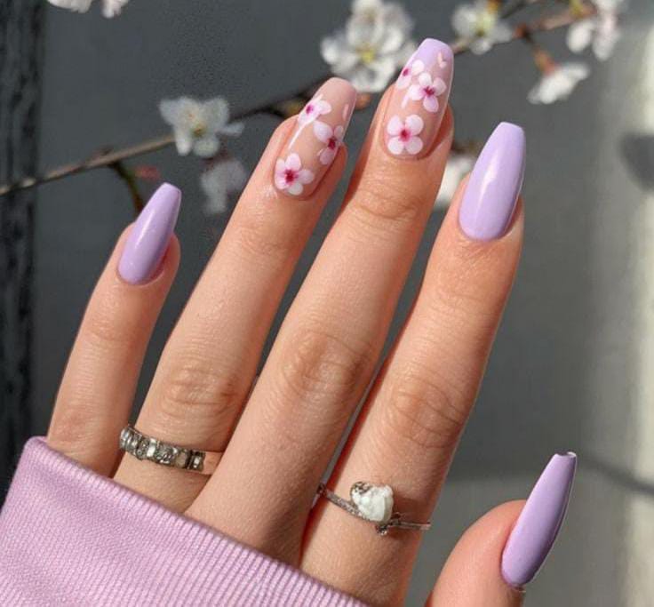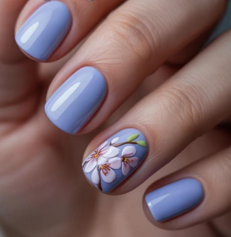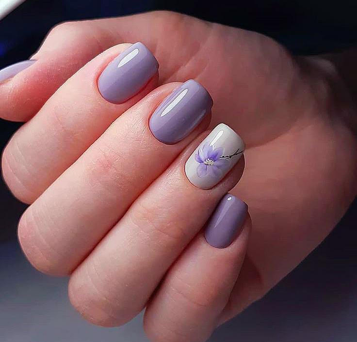 Muted lavender nails paired with a delicate floral accent create a calm and elegant spring style. The overall look is simple, graceful, and beautifully minimal April vibe.