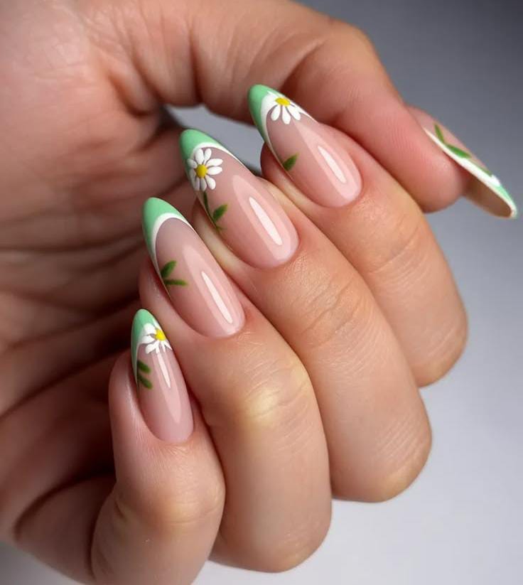 A sheer nude base is paired with soft green French tips and tiny daisy accents for a fresh spring look. The style feels bright, natural, and minimal floral for April days.