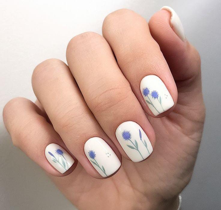 A soft white base is decorated with tiny blue wildflowers and thin green stems for a clean spring look. The design feels delicate, simple, and perfect for a fresh April manicure.