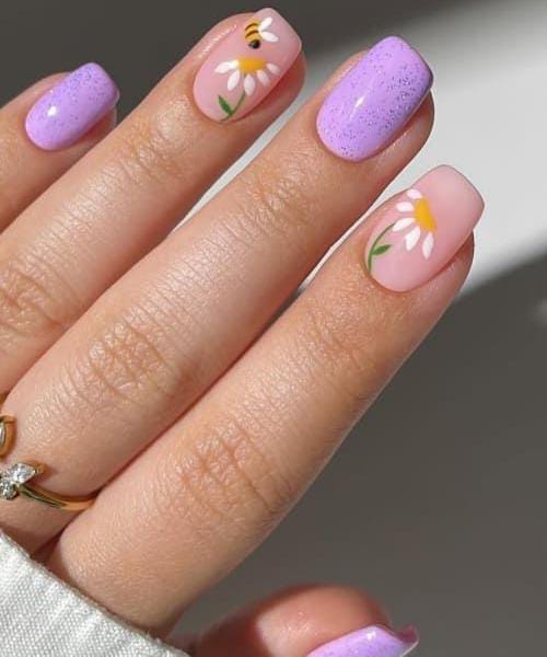 Soft lavender nails with a glossy finish are paired with delicate white daisy and tiny bee accents on a light pink base. The design feels fresh, simple, and perfectly suited for a cheerful April spring look.