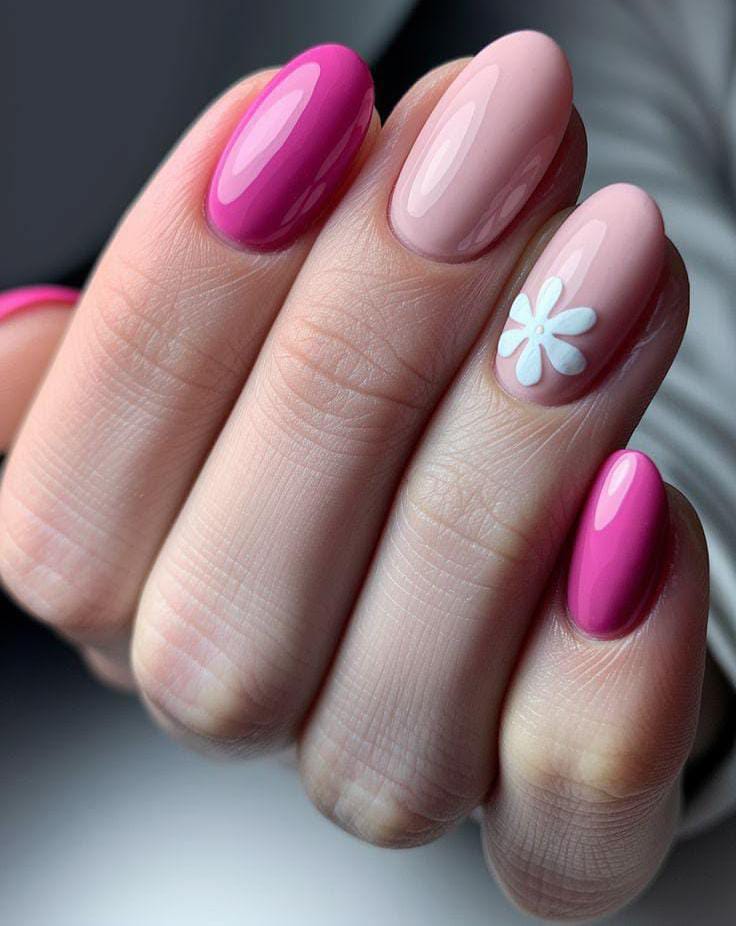 Glossy bright pink nails are paired with soft nude nails for a simple yet elegant contrast. A single white daisy accent adds a fresh and playful April spring touch.